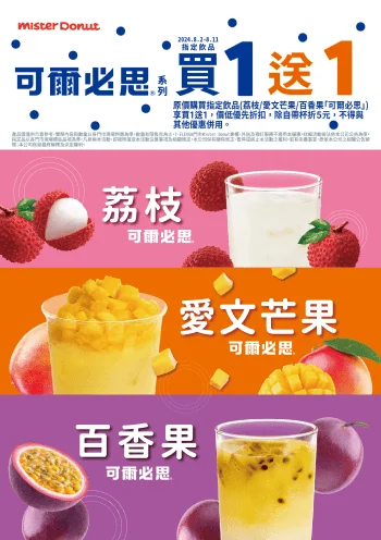 凡購買「可爾必思」聯名現做飲品可享買一送一優惠~